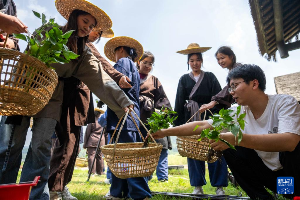 4月28日,在宁乡市炭河古城景区,学生在进行农耕实践。