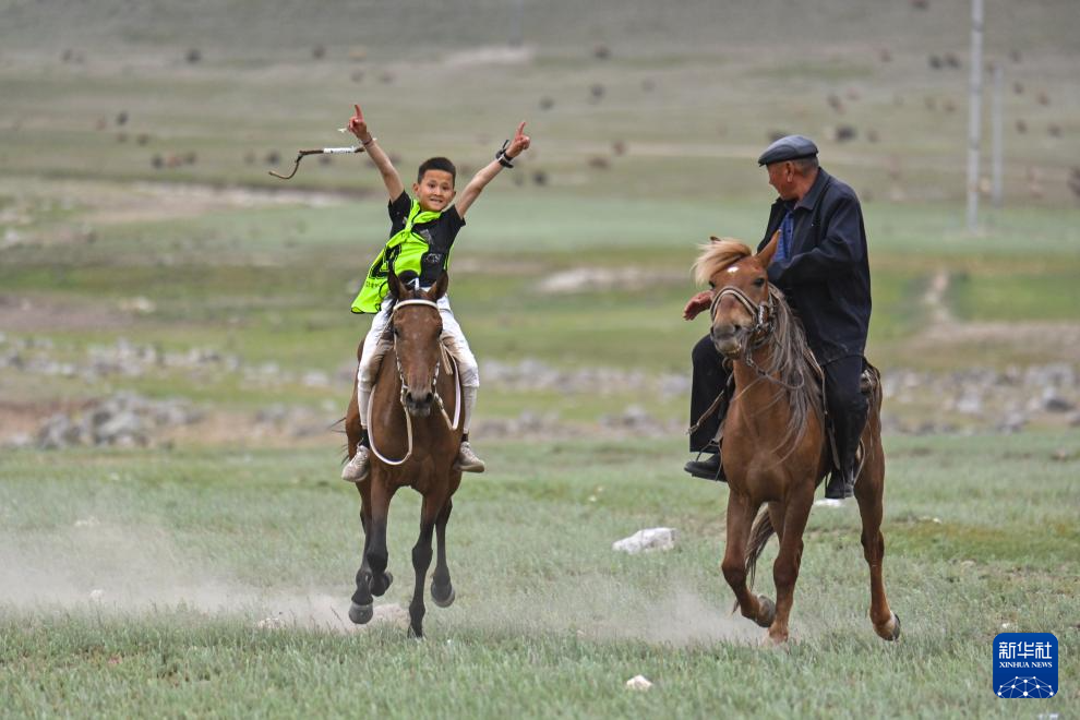 5月24日,在新疆阿勒泰市汗德尕特蒙古族乡,13岁的赛马选手卓玛尔提·卡德尔别克(左)取得第一名后庆祝。
