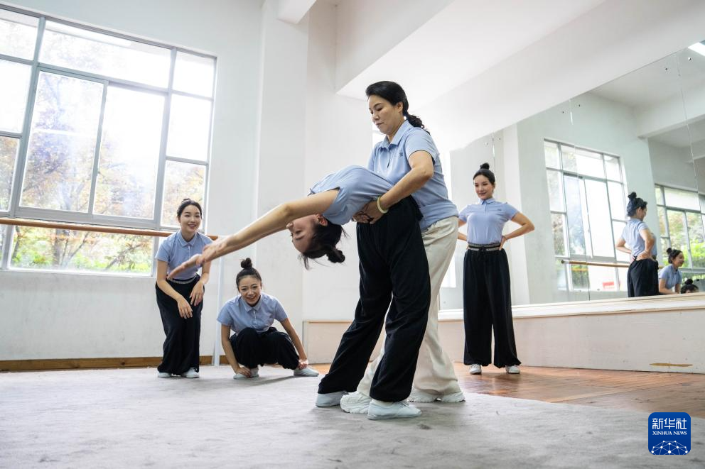 6月4日,在湖南省昆剧团练功房,资深演员王荔梅(后右)在帮助青年演员练习基本功。