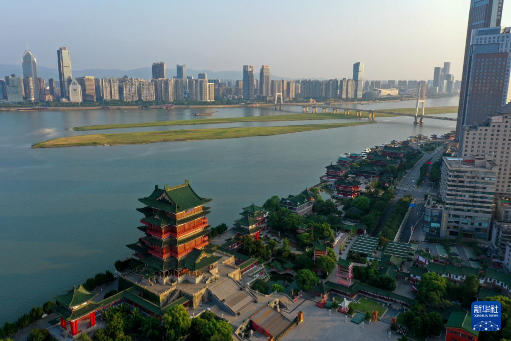 晨光中的江西南昌滕王阁景区(7月7日摄,无人机照片)。
