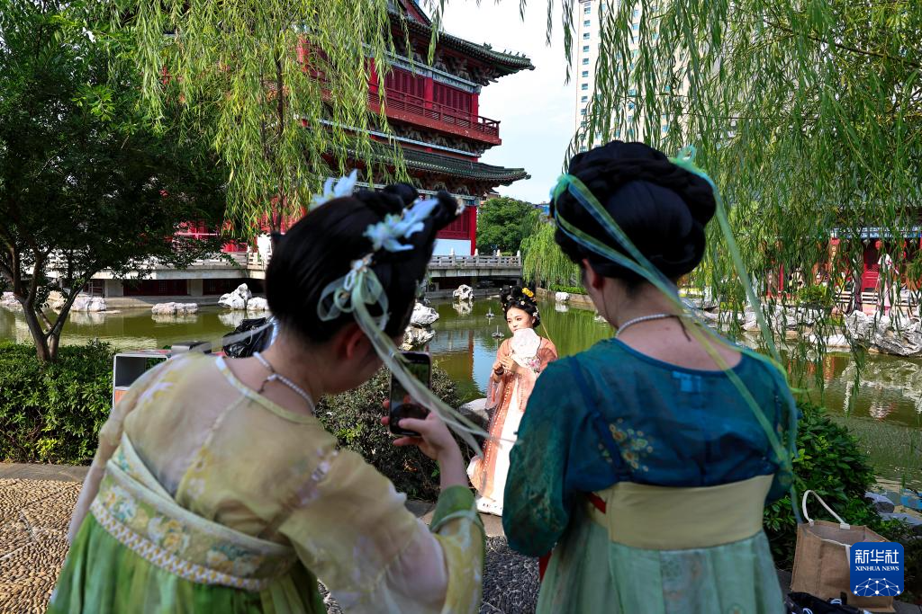 7月7日,身着古装的游客在江西南昌滕王阁景区游览留影。