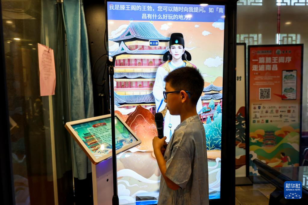 7月7日,一名来自河北秦皇岛的小学生在江西南昌滕王阁景区游客中心的智能背序亭内背诵《滕王阁序》。近年来,滕王阁景区推出背诵《滕王阁序》全文免门票活动,吸引了各地游客前来挑战。