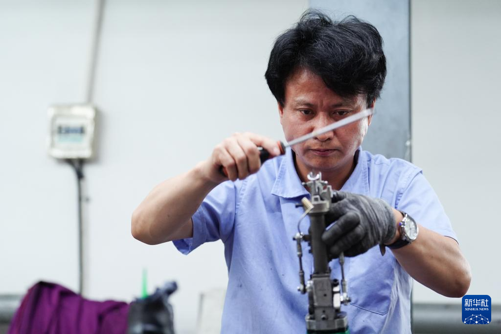 7月21日,工人在西宁市圣源地毯集团有限公司配件间检修藏毯制作工具。