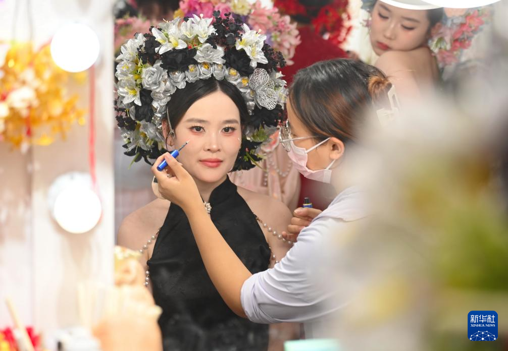 8月18日,来自厦门的游客在泉州市蟳埔村的一家簪花旅拍店化妆。