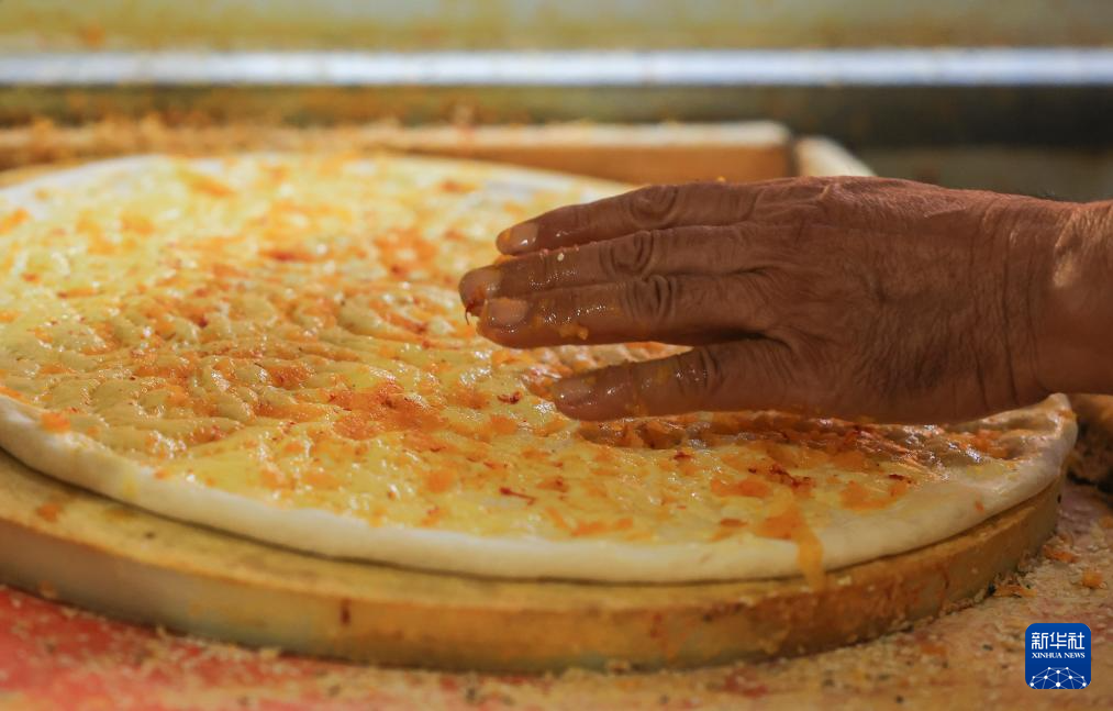 7月22日,在新疆库车市,热西提往馕坯上撒放香料。