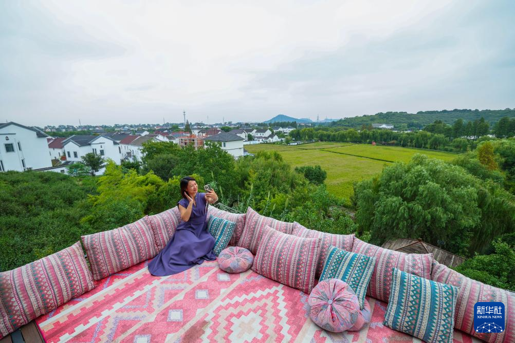 9月20日,游客在海盐秦山街道永兴村文溪坞“桃源文溪”山村景区自拍,这也是被沈荡镇一起带火的海盐特色文旅景点。