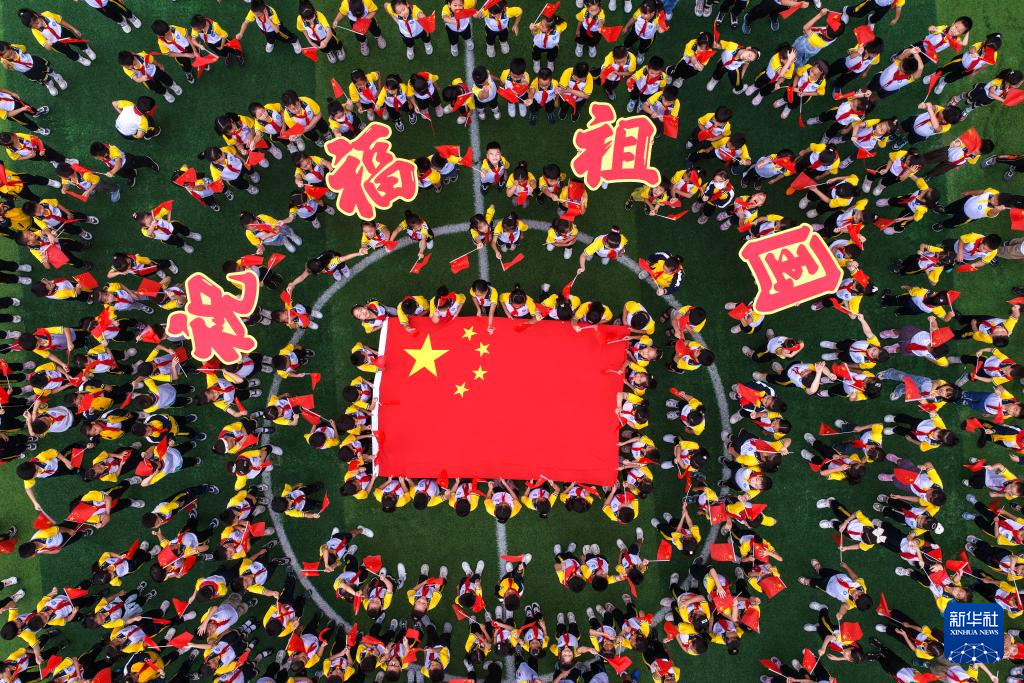 9月28日,江苏省泰州市姜堰区东桥小学教育集团东板桥校区学生学唱爱国歌曲,迎接国庆节(无人机照片)。