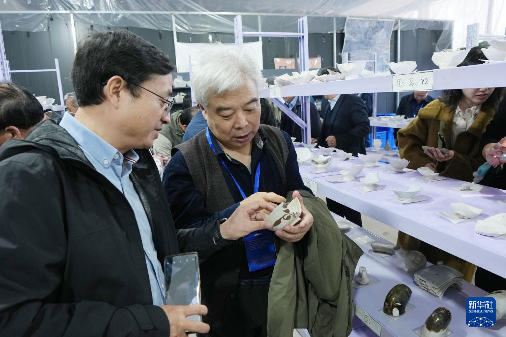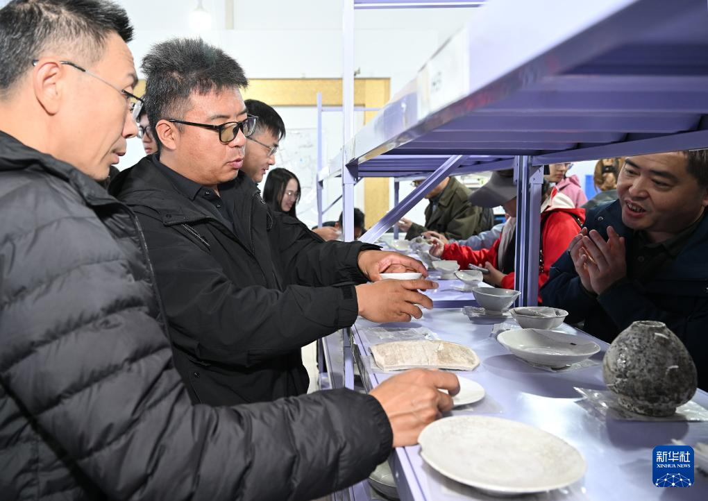 考古学家们在苏峪口瓷窑址考古队文物库房内对出土瓷器进行考察(10月13日摄)。