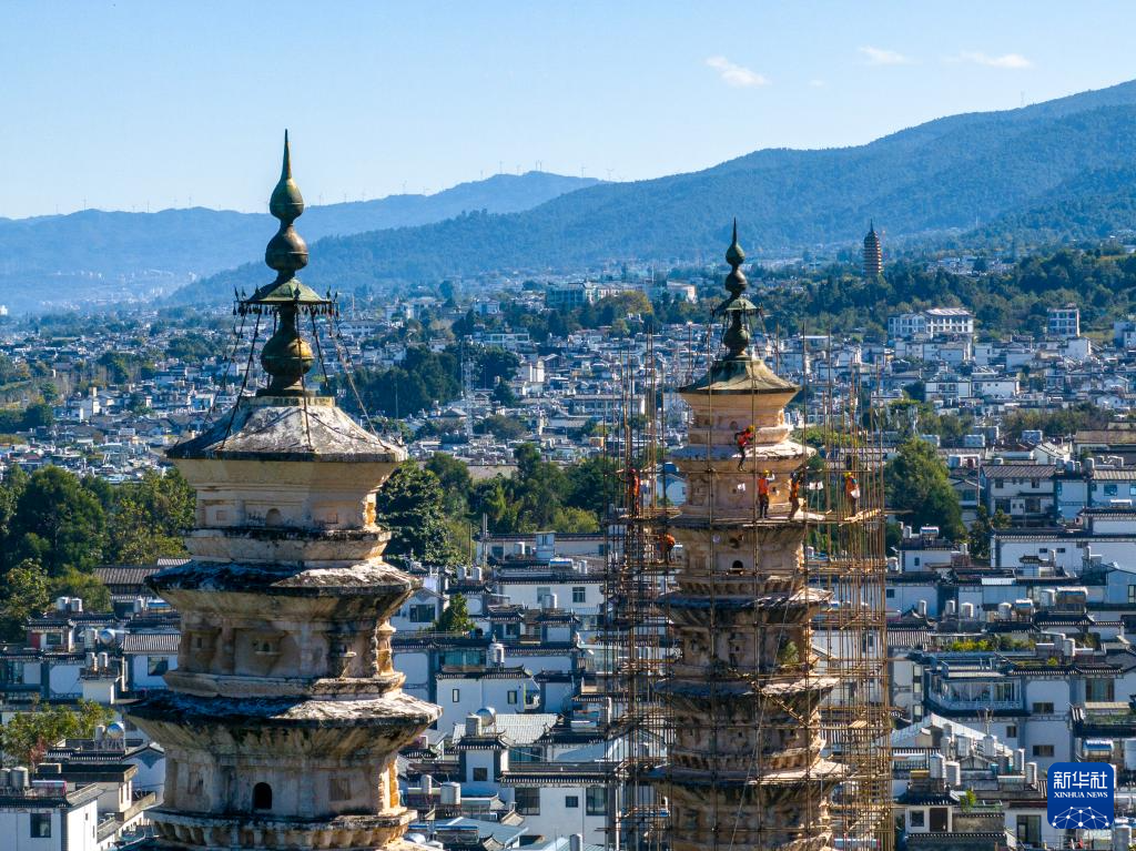 11月10日拍摄的云南大理崇圣寺三塔避雷装置安装工程现场(无人机照片)。