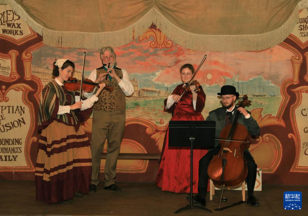 11月22日,在美国旧金山,人们身着维多利亚时期风格的服饰在狄更斯圣诞博览会上表演。