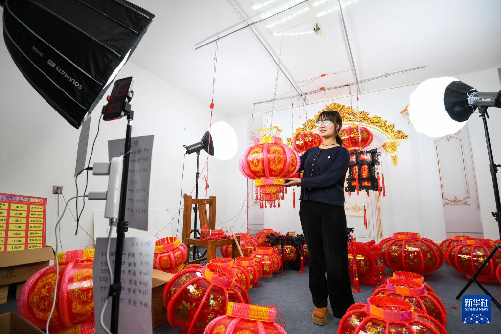 12月10日,在河北省石家庄市藁城区屯头村一家宫灯销售处,直播人员进行线上销售。