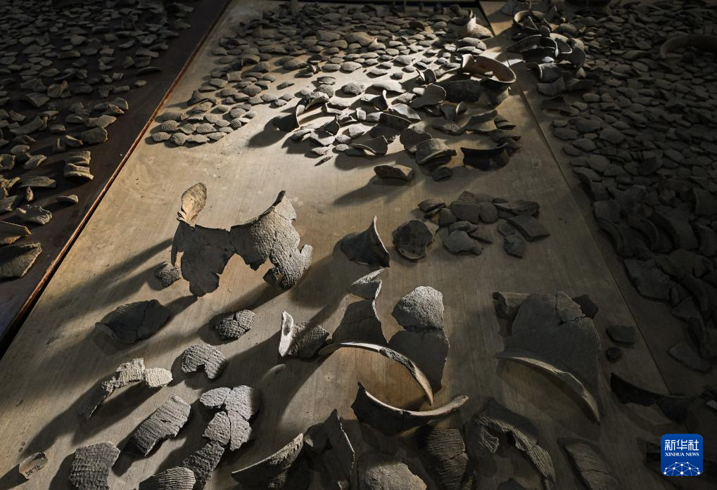 这是井头山遗址文物库房内展示的第一期发掘出土的大量陶片(12月15日摄)。