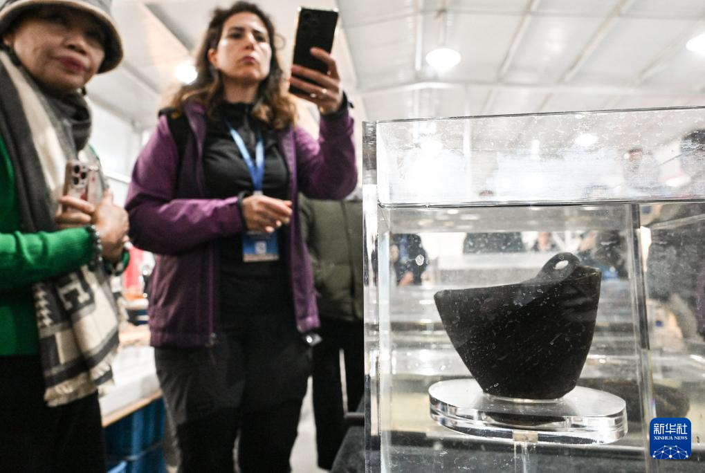 井头山遗址出土的一件单耳木碗吸引外国专家学者的关注(12月15日摄)。