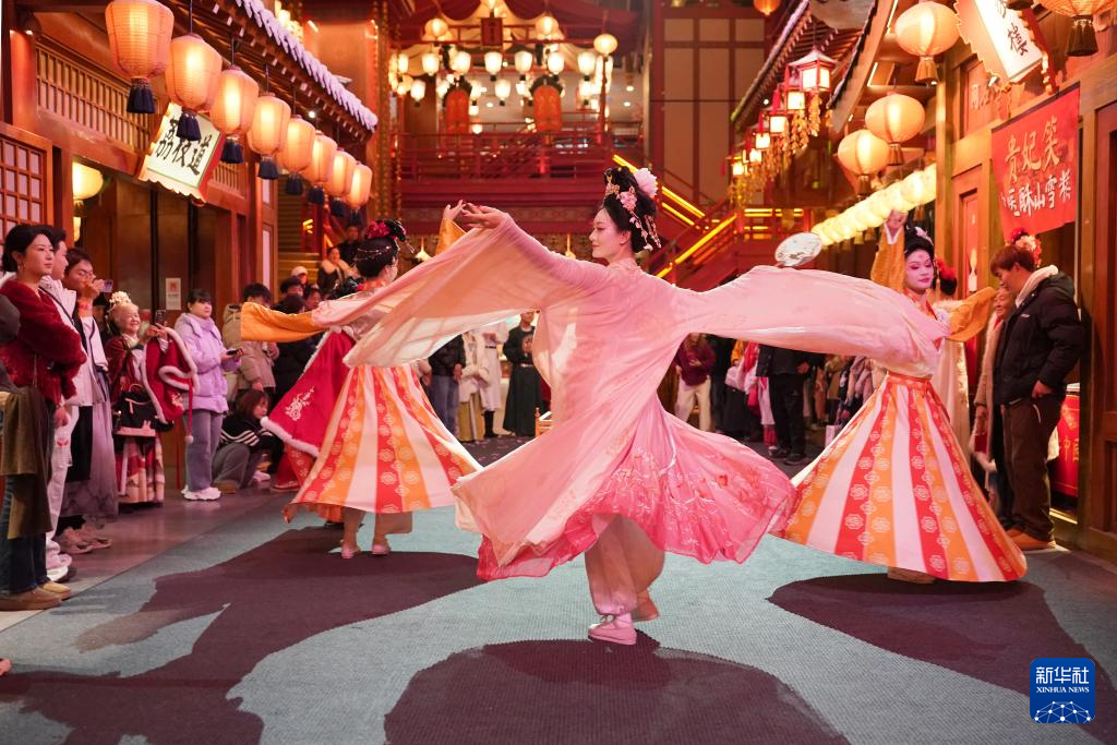 12月23日,演员在街区内表演大唐乐舞《霓裳羽衣舞》。