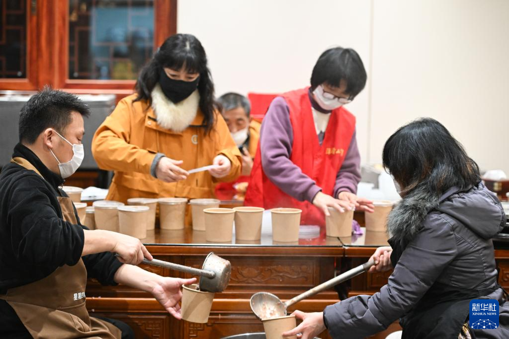 1月26日,在陕西省安康市平利县城关镇东城社区,志愿者为群众送上腊八粥。