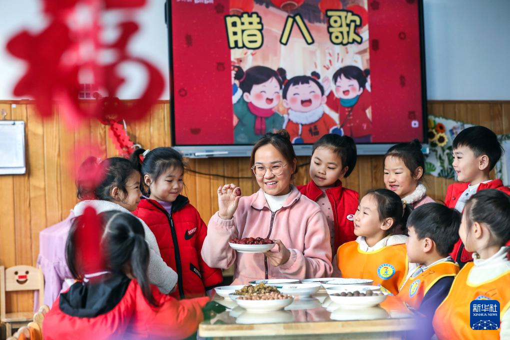 1月26日,在河南省焦作市博爱县县直幼儿园,老师为小朋友们讲解制作腊八粥的食材。