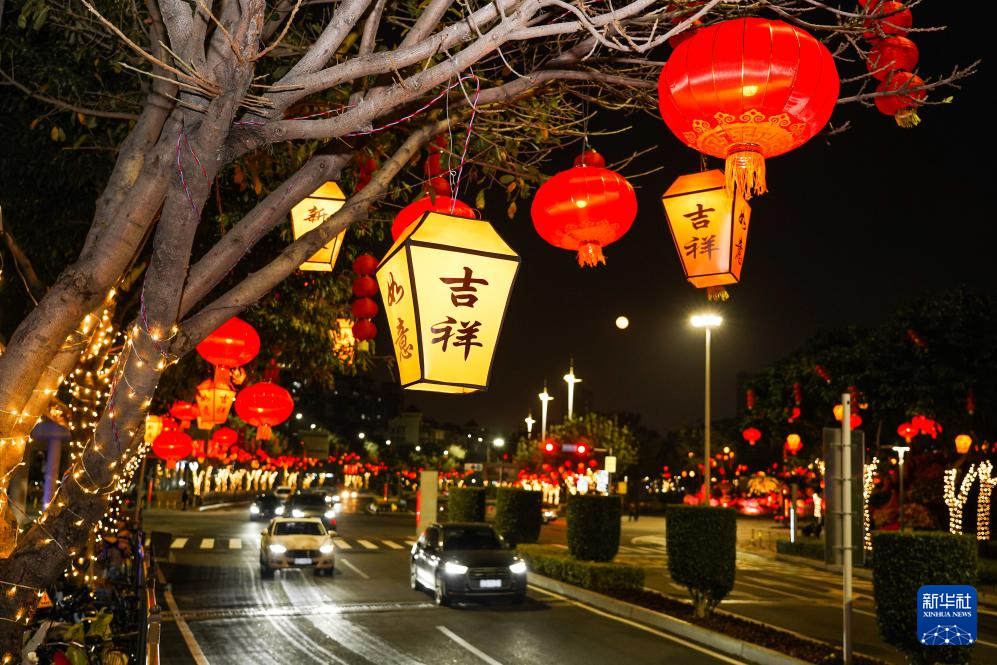 福建省厦门市海沧区滨湖北路行道树上挂满各式春节灯饰(2月2日摄)。