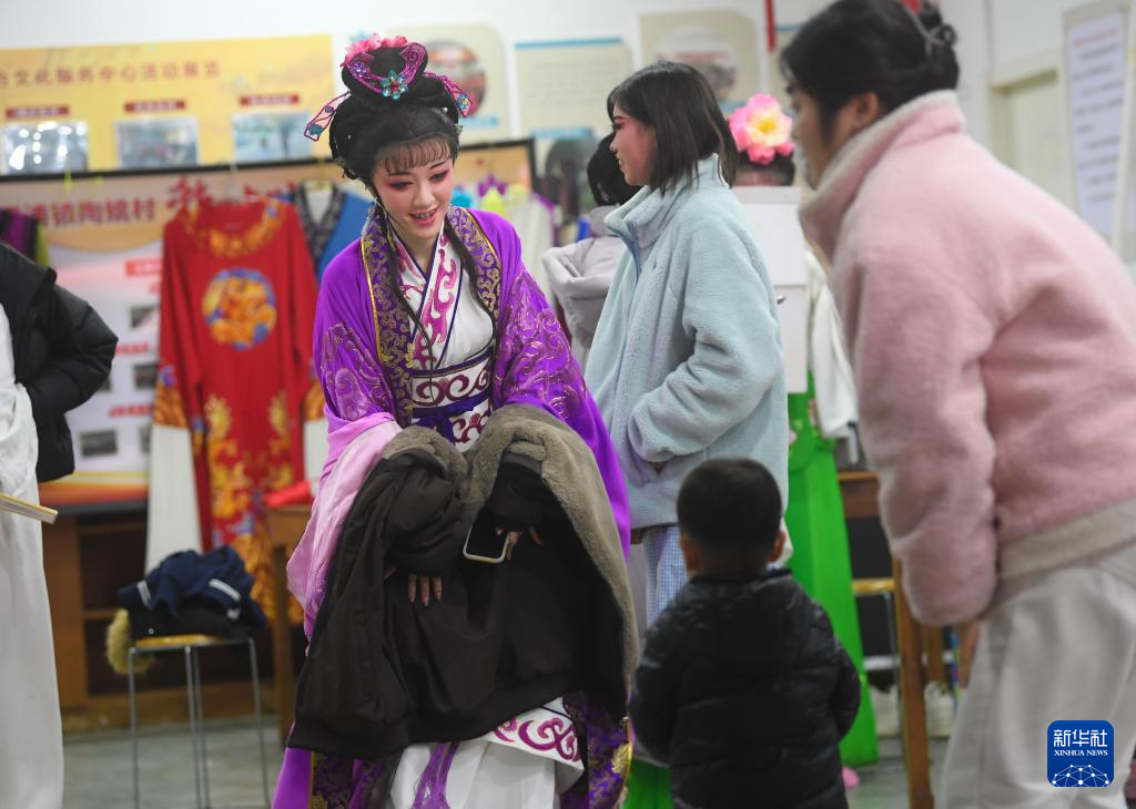 1月27日,在金华市婺城区莘畈乡吴村,九州婺剧团的演员在演出前准备。