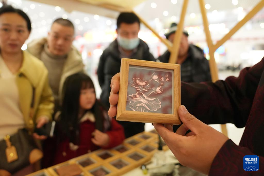 2月10日,在徐州东站,手工艺人展示拓片作品。