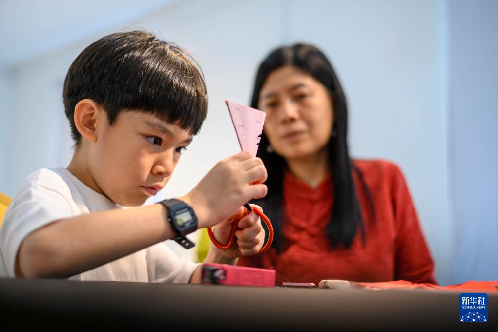 2月7日,在马来西亚吉隆坡,一名儿童体验剪纸技艺。