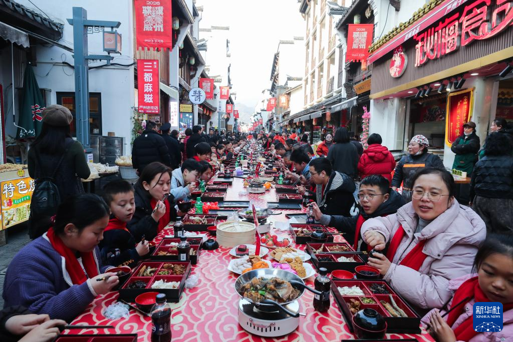 2月11日,当地群众与各地游客在古街围坐长桌,品尝美食。