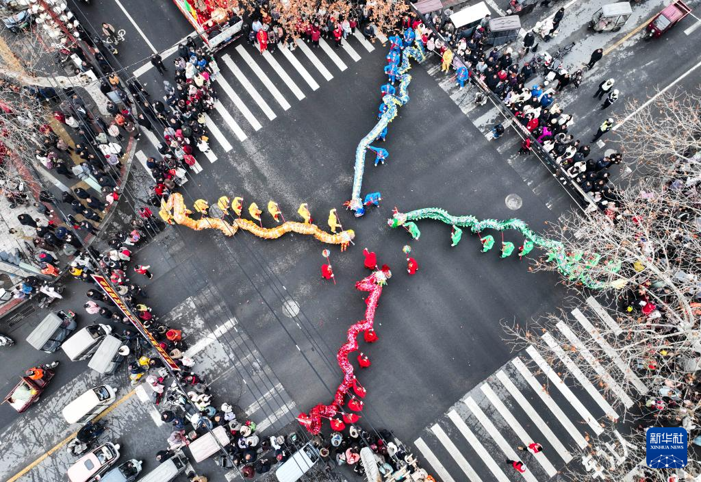 3月2日,游客在河南省济源市济水街道观看舞龙表演(无人机照片)。