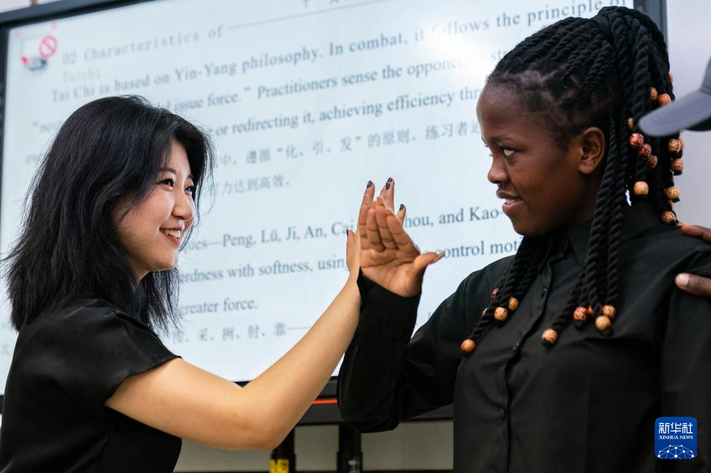 3月18日,在肯尼亚内罗毕大学孔子学院,老师与当地学生在课堂上对练太极推手。