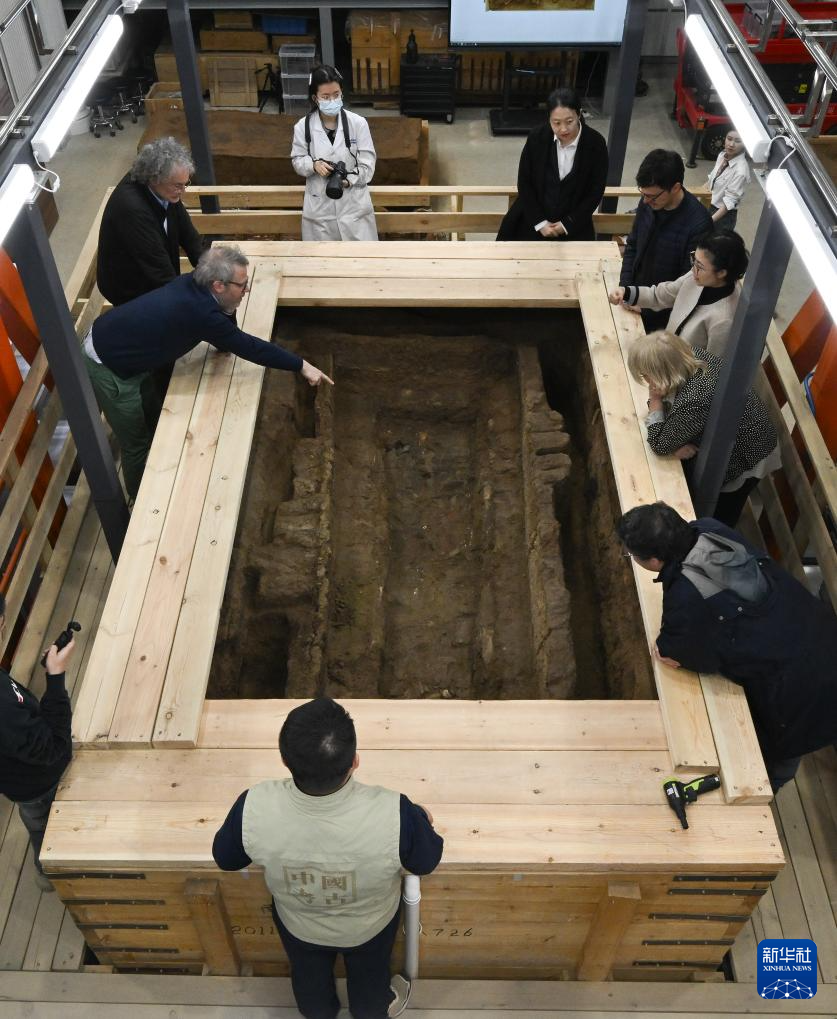 4月2日,参加中意文化遗产保护修复国际圆桌会议的意方专家在中国社会科学院科技考古与文化遗产保护重点实验室参观了解科技考古与文物保护情况。这是专家们在实验室考古方舱内参观科技考古发掘。
