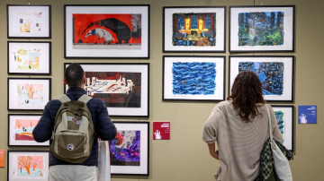 4月14日,在也门首都萨那,人们参观艺术展上的画作。