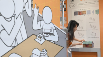 4月14日,在意大利博洛尼亚,观众在第63届博洛尼亚国际儿童书展上体验虚拟现实阅读设备。