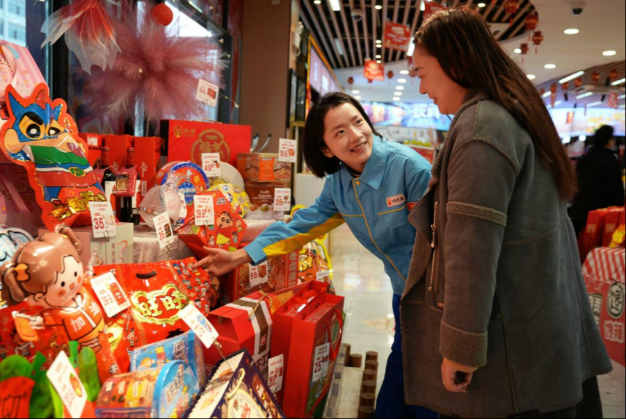 图为在便利店年货专区,加油站员工热情为顾客挑选心仪的节日商品。