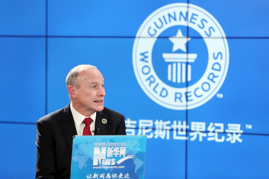 Photo: Guinness World Records Global President Alistair Richards receives interview with Xinhuanet. (Xinhuanet/ Guo Xiaotian)