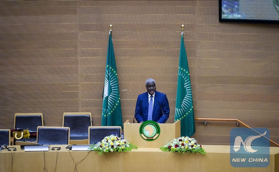 African Union Chairperson Moussa Faki Mahamat speaks during the opening session of the 32nd Ordinary Session of the Executive Council of the African Union (AU) in Addis Ababa, Ethiopia, Jan. 25, 2018. Moussa FakiMahamat said on Thursday African leaders and citizens are still in shock at vulgar comments about the continent attributed to U.S. President Donald Trump. (Xinhua/Michael Tewelde)