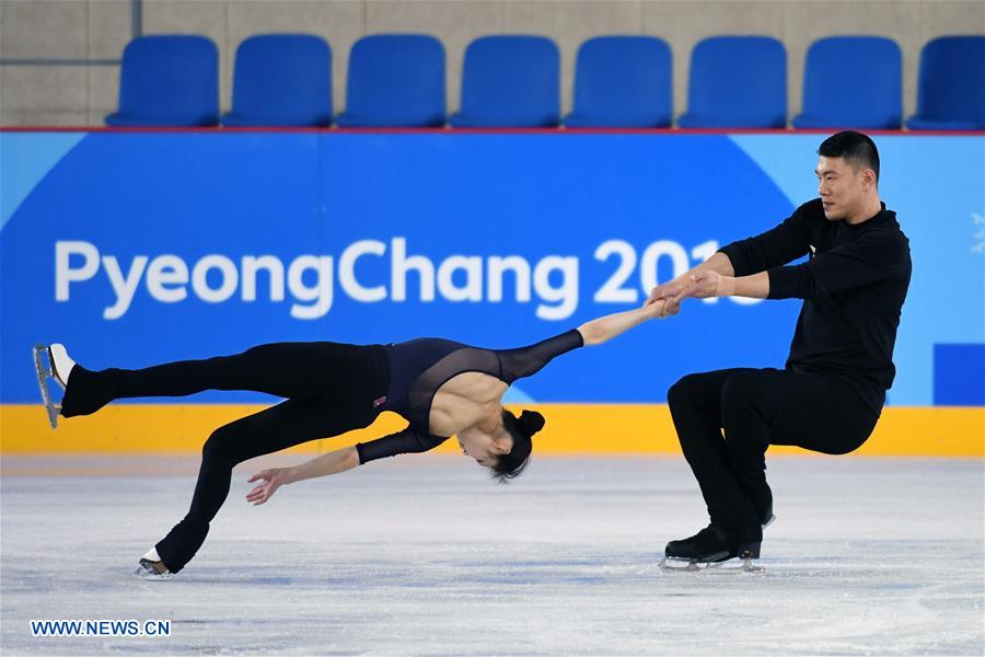 China's figure skaters Yu Xiaoyu (L) and Zhang Hao train ahead of their matches on 2018 PyeongChang Winter Olympic Games at Gangneung Ice Arena, South Korea, Feb. 7, 2018. (Xinhua/Ju Huanzong)