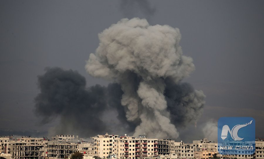 A picture taken on Feb. 20, 2018 shows smoke plumes rising following a reported regime air strike in the rebel-held town of Hamouria, in the besieged Eastern Ghouta region on the outskirts of the capital Damascus. (Xinhua/AFP)