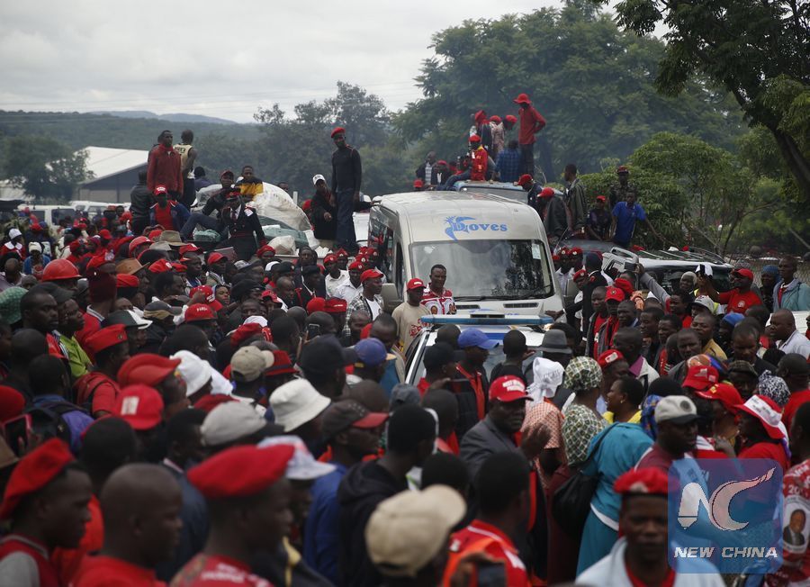 Supporters wait for the van carrying the body of former Zimbabwean Prime Minister and opposition leader Morgan Tsvangirai in Buhera, Manicaland Province, Zimbabwe, on Feb. 20, 2018. Tsvangirai was buried at his rural home in Buhera on Tuesday. (Xinhua/Shaun Jusa)