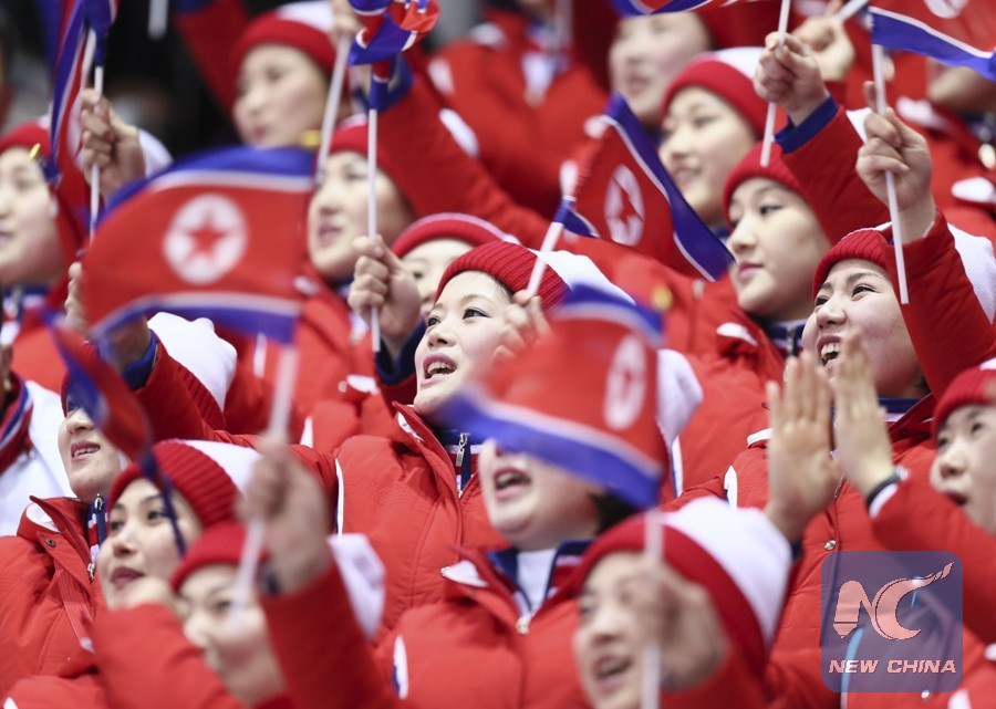 A cheerleader from the Democratic People's Republic of Korea (DPRK) leads the squad before the preliminary match of women's ice hockey between Switzerland and the unified team of DPRK and South Korea at the Pyeongchang 2018 Winter Olympic Games at the Kwandong Hockey Centre in Gangneung, South Korea, on Feb. 10, 2018. (Xinhua/Wang Song)