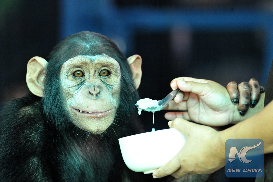 A chimpanzee enjoys cold beverage offered by staff members at the Dusit Zoo in Bangkok, Thailand, March 30, 2017. (Xinhua/Rachen Sageamsak)