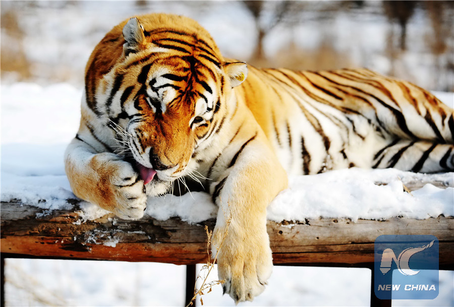 A Siberian tiger licks claws at the Siberian Tiger Park in Harbin, capital of northeast China's Heilongjiang Province, Nov. 19, 2012. (Xinhua/Wang Jianwei)