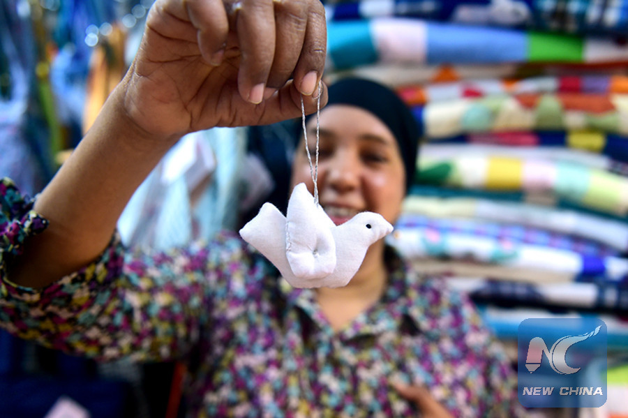 An Egyptian woman displays a handicraft made from recycled materials at an APE workshop in Mokattam area of Cairo, Egypt, on March 7, 2018. (Xinhua/Zhao Dingzhe)