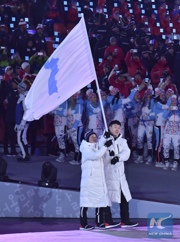 Flag bearer of the Democratic People's Republic of Korea (DPRK) Hwang Chung-gum (L) and flag bearer of South Korea Won Yun-jong march together under a unified Korean flag during the opening ceremony of the 2018 PyeongChang Winter Olympic Games at PyeongChang Olympic Stadium in PyeongChang, South Korea, Feb. 9, 2018. (Xinhua/Lui Siu Wai)