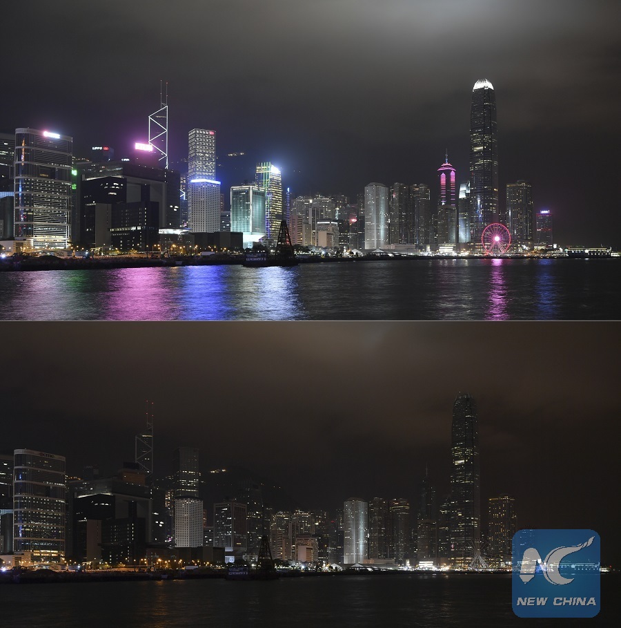 HONG KONG, March 24 (Xinhua) -- The dazzling view of Hong Kong's Victoria Harbor "disappeared" for an hour on Saturday night as the light of most buildings went off in response to global environmental movement Earth Hour 2018.