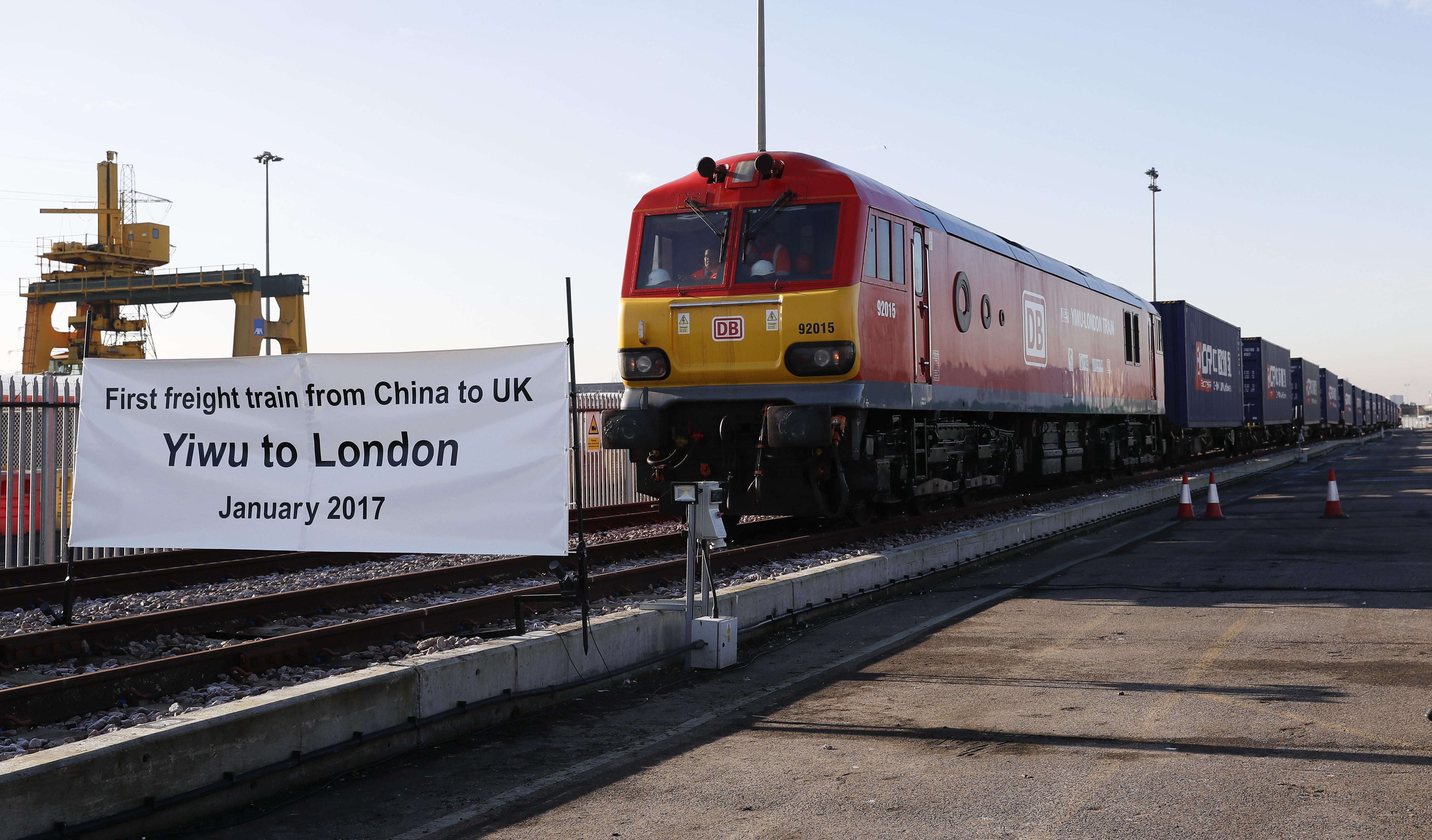 File photo taken on Jan. 18, 2017 shows a freight train from Yiwu City in east China's Zhejiang Province, arrives in Barking, east London, Britain. (Xinhua/Han Yan)