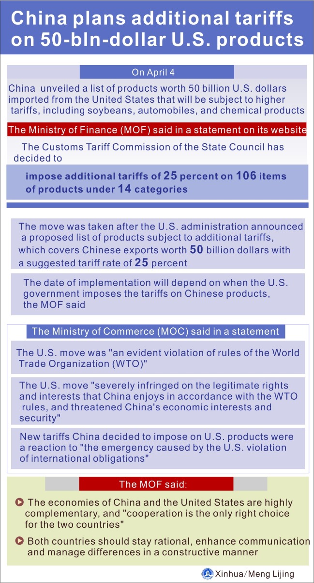 China unveils a list of products worth 50 billion U.S. dollars imported from the United States that will be subject to higher tariffs, including soybeans, automobiles, and chemical products on April 4. (Xinhua/Meng Lijing)