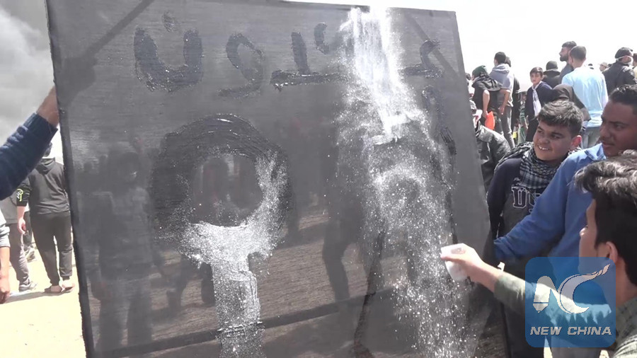 GAZA, April 6 (Xinhua) -- Amid the heavy black smokes of burnt car tires and the buzzing sounds of of bullets, Bashar al-Daya, a Palestinian young man, was busy painting a map of Palestine during an anti-Israeli protest along the Gaza-Israel border.