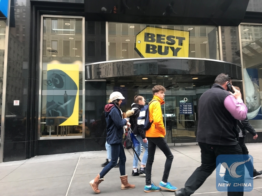 People walk past a Best Buy store, where a number of Chinese electronic products are being sold, in New York, the United States, on April 4, 2018. (Xinhua Photo)