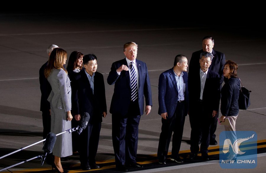 U.S. President Donald Trump (C) speaks to the media after welcoming Kim Dong-chul, Kim Hak-song and Tony Kim back to the United States at Joint Base Andrews in Washington D.C., the United States, May 10, 2018. Three U.S. citizens that were just freed by the Democratic People's Republic of Korea (DPRK) arrived in Washington early Thursday, as the two countries saw their ties warm up in recent weeks. (Xinhua/Shen Ting)
