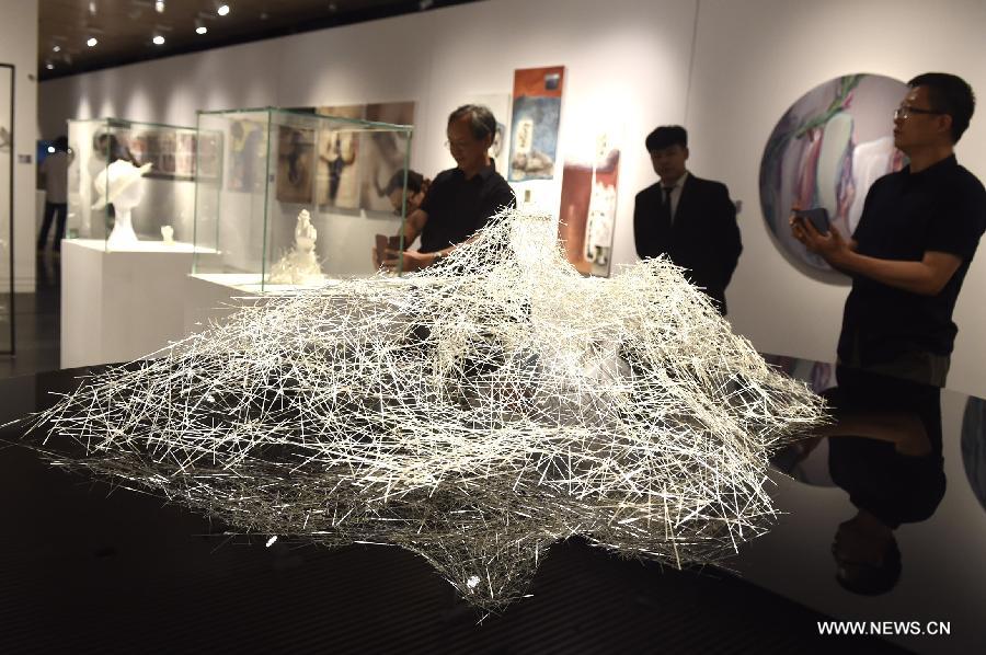 People visit a graduation exhibition of undergraduates of Tsinghua University Academy of Arts and Design in Beijing, capital of China, June 12, 2018. More than 500 pieces (sets) of works were displayed at the exhibition. (Xinhua/Luo Xiaoguang)