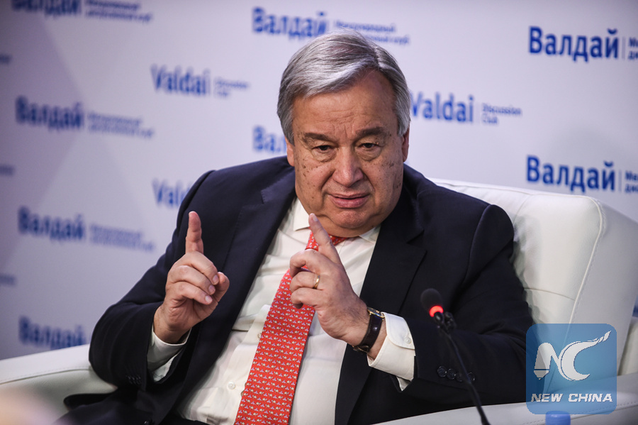 United Nations Secretary-General Antonio Guterres addresses the press at the Russian think tank Valdai Discussion Club in Moscow on June 21, 2018. (Xinhua/Evgeny Sintsyn)