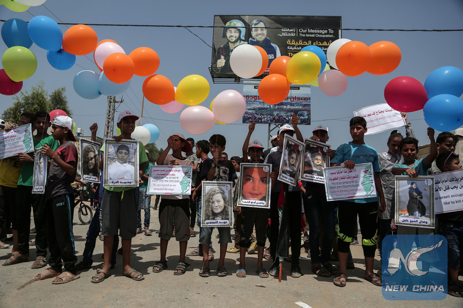 GAZA, July 24 (Xinhua) -- Hundreds of Palestinian children demonstrated on Tuesday in the northern Gaza Strip, demanding an end to the 11-year Israeli blockade on the Hamas-ruled territory.